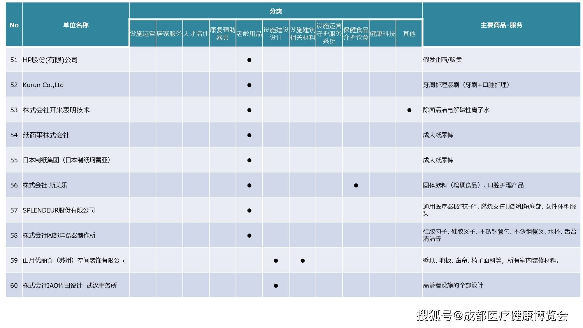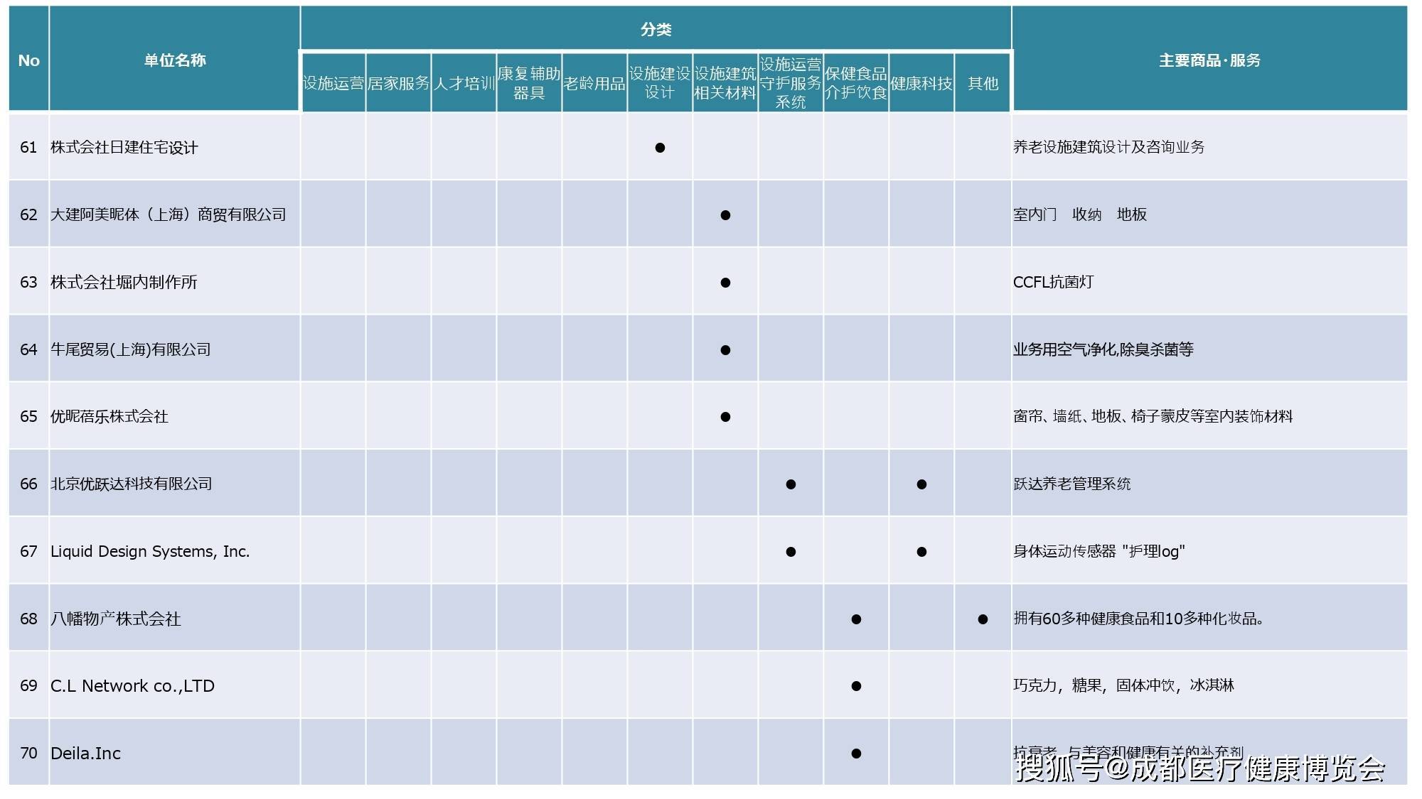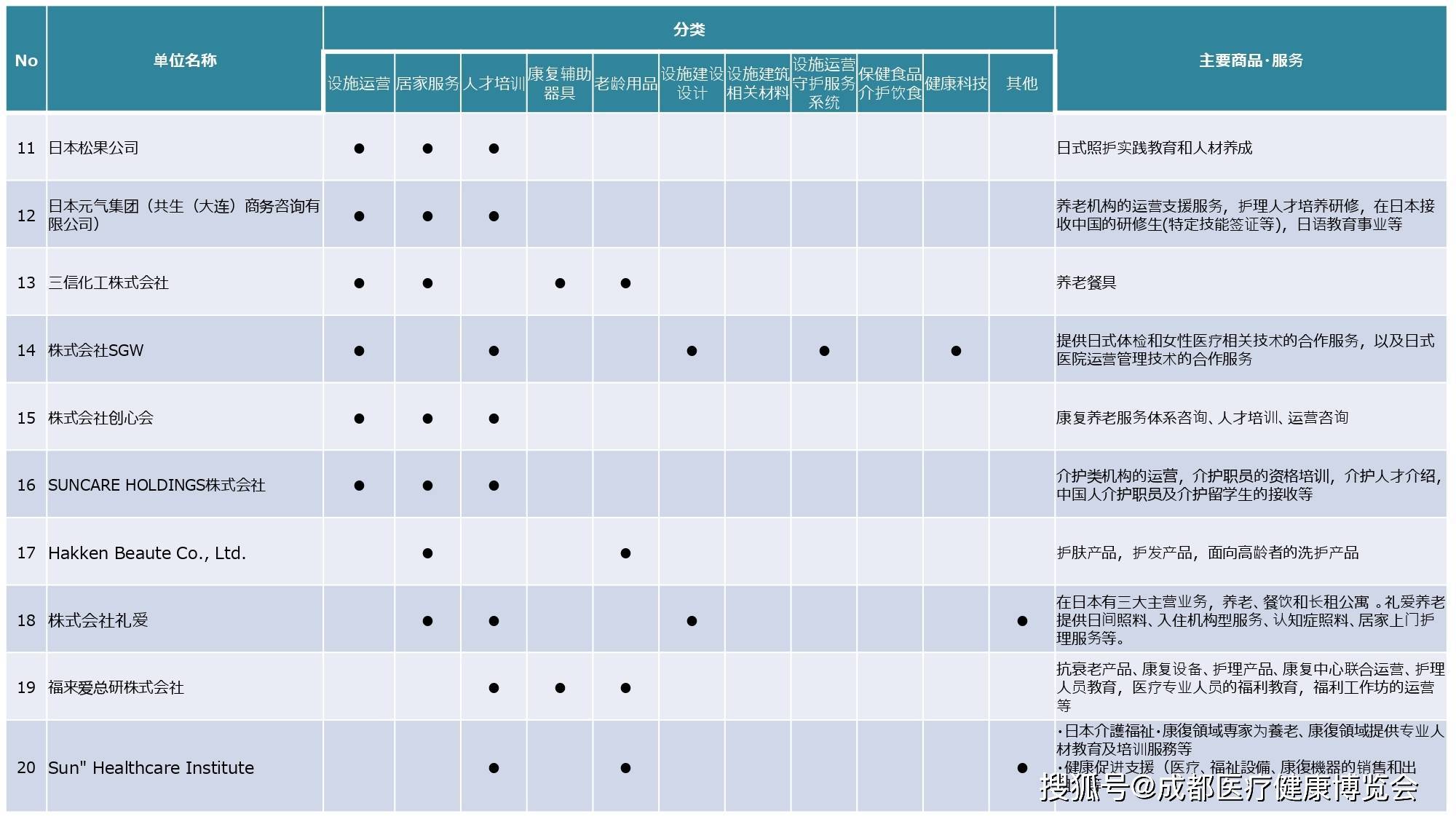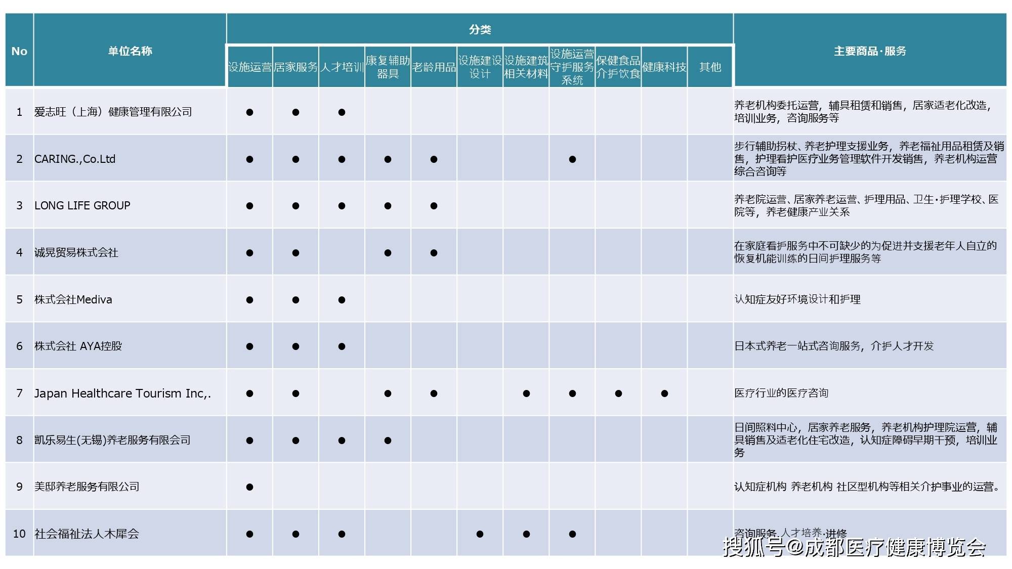 日方将邀请的参会企业涵盖设施运营、居家服务、人才培养、康复辅助器具、老龄用品、设施建设设计、设施建筑相关材料、设施运营守护服务系统、保健食品介护饮食、健康科技 等多种业务类型。