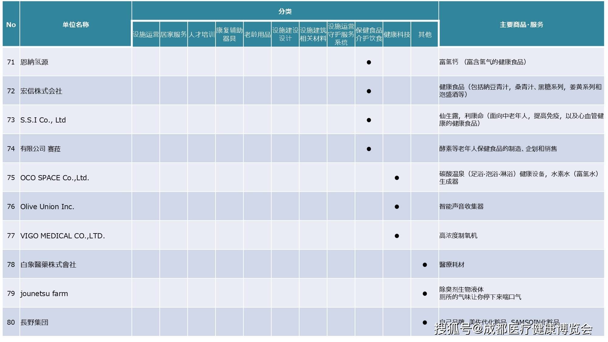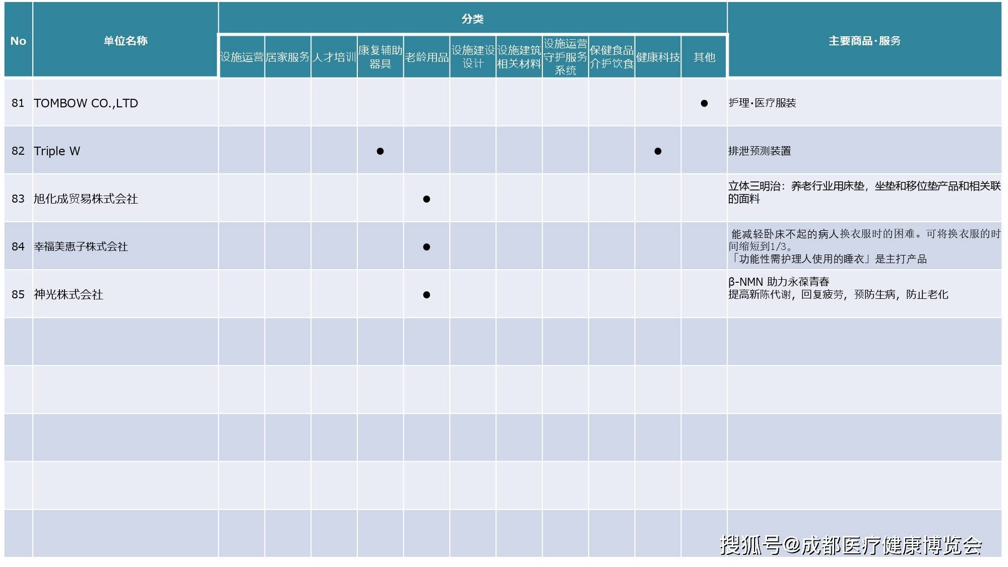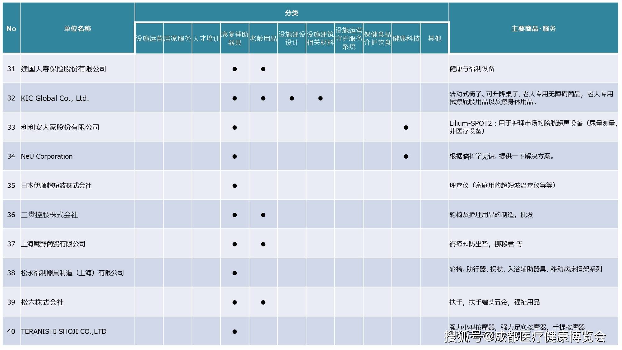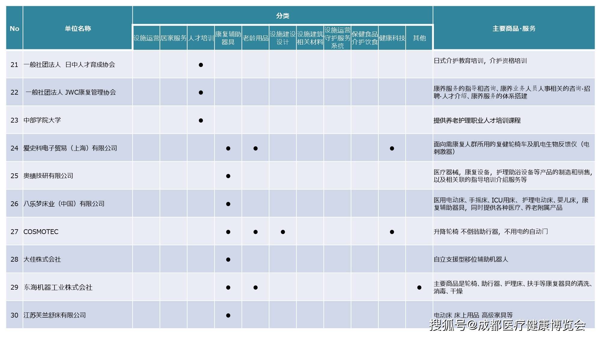 日方将邀请的参会企业涵盖设施运营、居家服务、人才培养、康复辅助器具、老龄用品、设施建设设计、设施建筑相关材料、设施运营守护服务系统、保健食品介护饮食、健康科技 等多种业务类型。